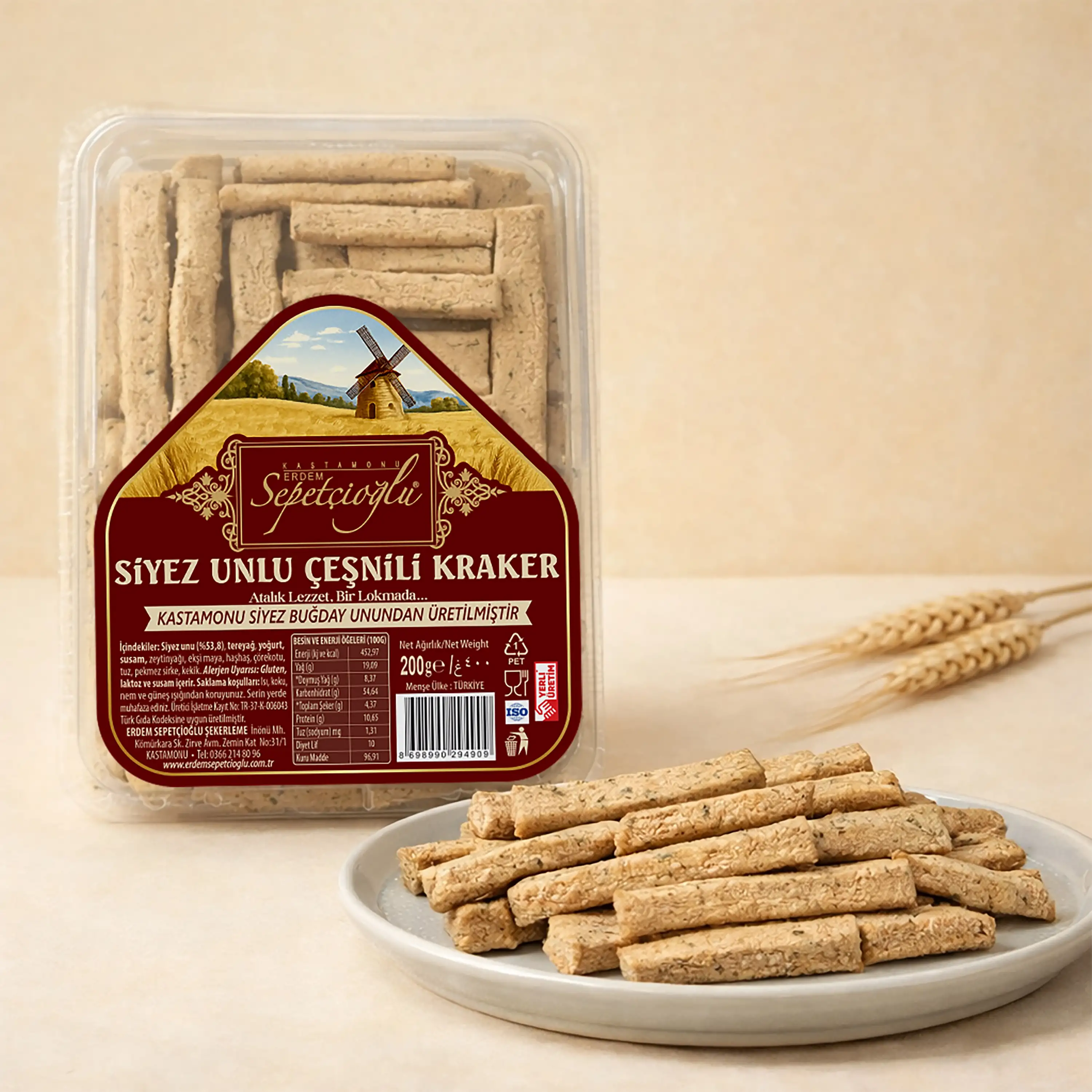 Siyez unlu çeşnili kraker, Anadolu’nun en eski buğday türlerinden biri olan siyez buğdayı ile hazırlanan, yoğun aromalı ve kıtır yapısıyla öne çıkan özel bir atıştırmalıktır.