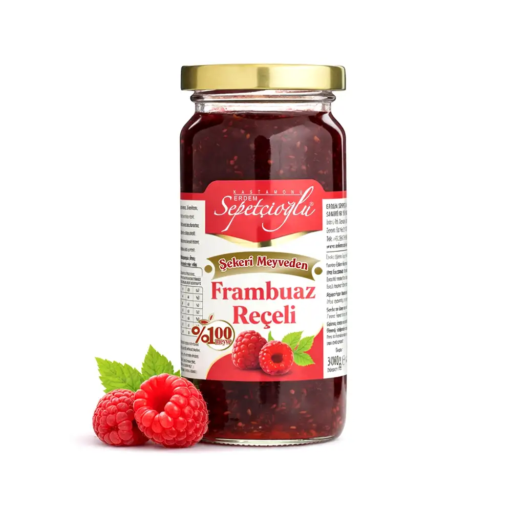 Sepetçioğlu Frambuaz Reçeli, frambuazın kendine özgü aromatik ve hafif ekşi karakterini, elma suyu konsantresi ile dengelenmiş bir tatlılıkla bir araya getirir. Bu özel formülasyonda pancar şekeri kullanılmaz.