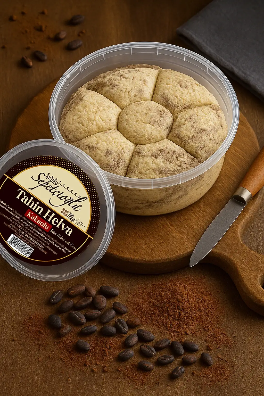İçindekiler: Tahin (%52),pancar şekeri, kakao (%0,07),çöğen suyu, asitliği düzenleyici (E330).